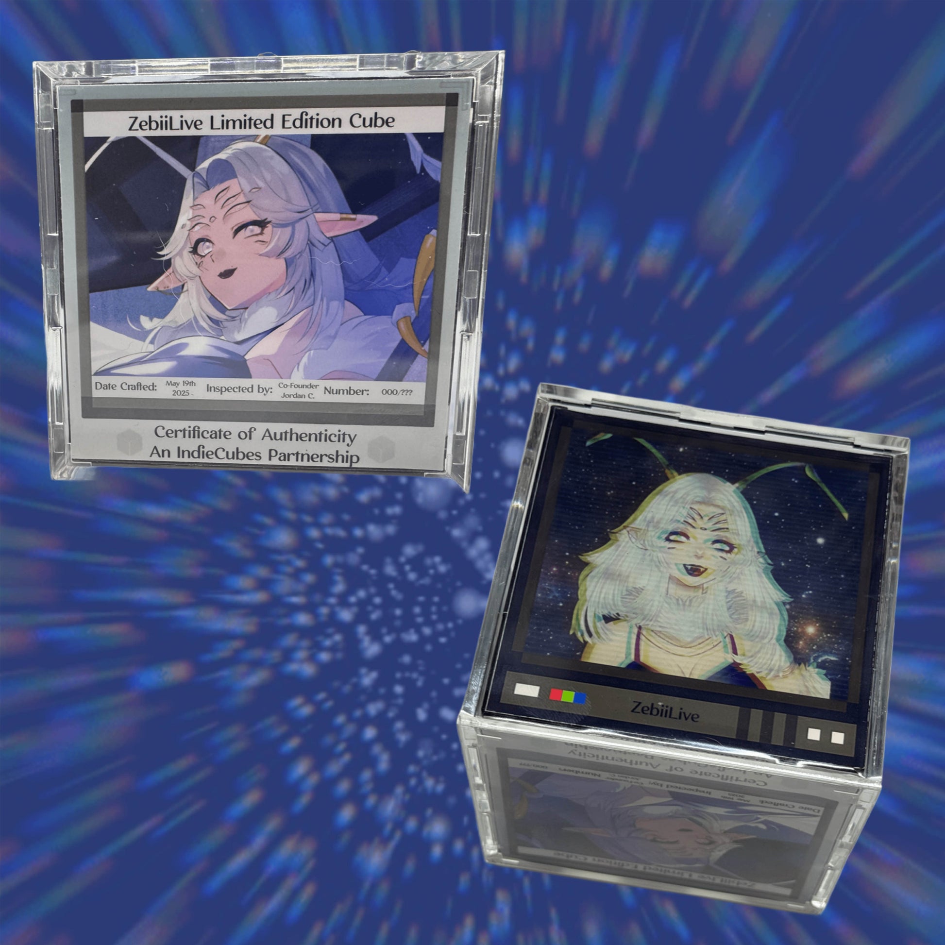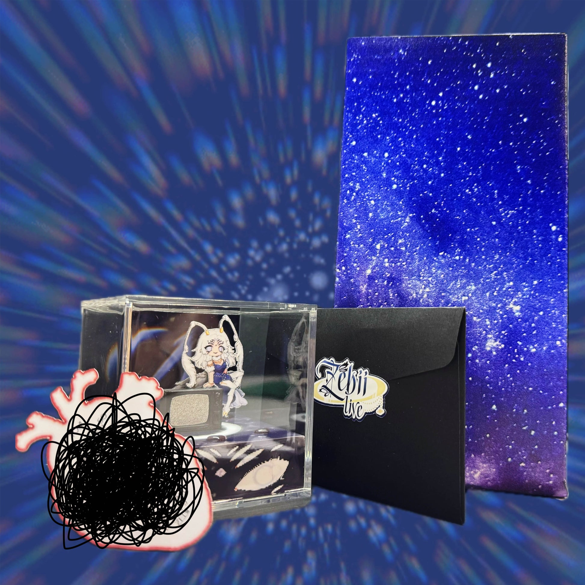 Chaos Critter of the Cosmos, Zebii is here! Peer into the window of her Orbiter, as she delicately rests on the TV she may, or may not, pop out of. Surrounded by stolen hearts and her closest worm pal, Giyo, she aims to beckon you in.